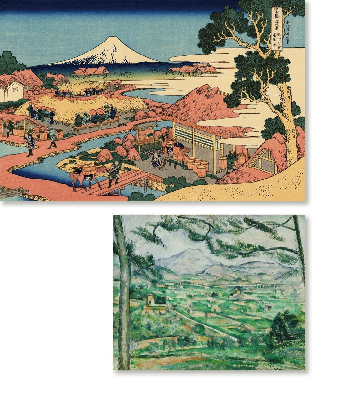 In scholarly discussions, it has been noted that Cézanne was deeply affected by the compositional styles of Japanese ukiyo-e artists like Hokusai. He admired the way Hokusai drew Mt. Fuji from various angles, which influenced Cézanne's own series of paintings depicting Mont Sainte-Victoire. Cézanne's adaptation of natural forms and his approach to framing landscapes with trees are seen as reflections of Japanese artistic techniques.